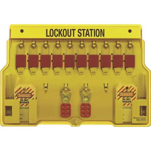 The Master Lock number 1483BP1106 Safety Lockout Covered Padlock Station includes 10 American Lock number A1106RED anodized aluminum keyed different padlocks. Padlock station features integrated, 1-piece molded construction to eliminate loose parts and resilient polycarbonate material to provide twice the heat resistance and quadruple the impact strength of typical stations. The exclusive translucent cover protects contents and is lockable to prevent loss of valuable products. Safety hasps and tags included.