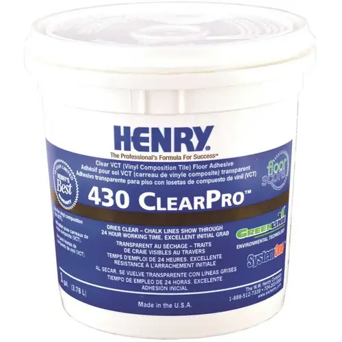 Premium, clear thin-spread adhesive designed to install vinyl composition tile (VCT) in residential and commercial installations. Henry ClearPro is solvent free and has antimicrobial product protection for clearer finishes. The ClearPro's formula is an alkali and moisture resistant formula up to 90% RH.