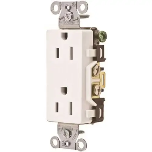 Hubbell commercial grade receptacles make installation easy featuring single tab breakoff ears and a self-grounding staple; durable construction with nylon face and base. Devices are fork terminal capable and feature split circuit tab easy access. Sturdy construction with a wrap-around galvanized steel strap.