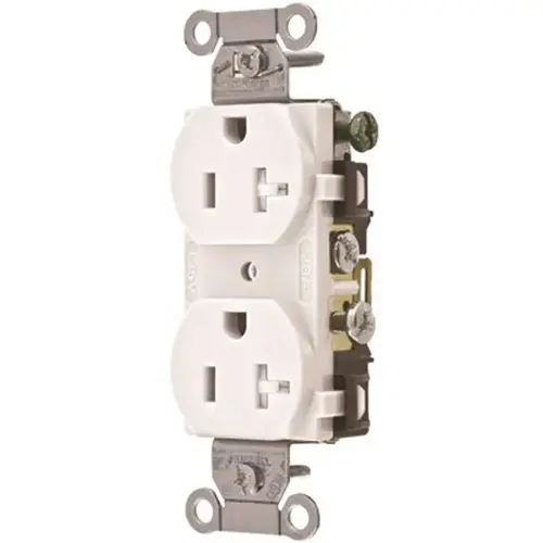 Hubbell commercial grade receptacles make installation easy featuring single tab breakoff ears and a self-grounding staple; durable construction with nylon face and base. Devices are fork terminal capable and feature split circuit tab easy access. Sturdy construction with a wrap-around galvanized steel strap.