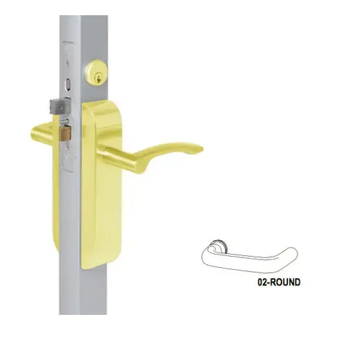Dual Force Interconnected Lock, 1-1/8" Backset, Flat Strike, Aluminum Faceplate, Low Profile 02 Round Lever Trim, Satin Stainless Steel