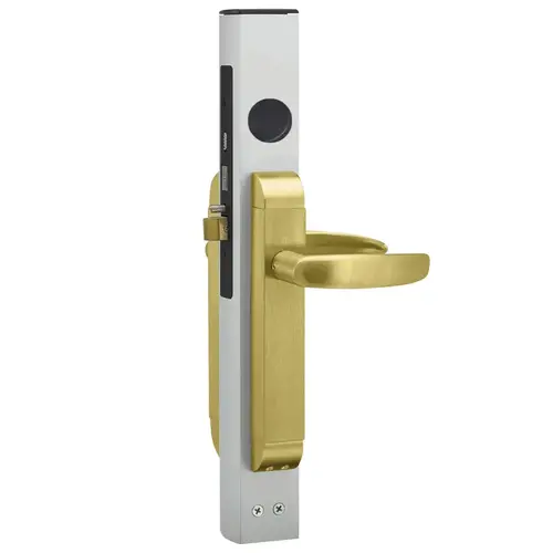 Dual Force Interconnected Lock, 1-1/8" Backset, Flat Center Hung Strike, 4-1/4", Black Faceplate, Electrified 01 Curve Lever Trim, Satin Brass