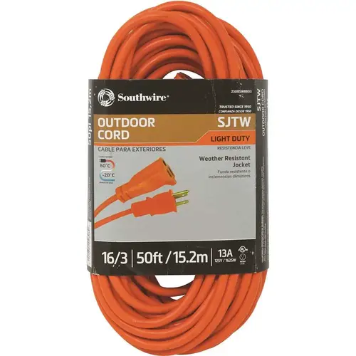 Reliably power-up electric tools and equipment outdoors with our 50 ft. 16/3 SJTW Orange Extension Cord. This cord features a light-duty, weather resistant, jacket that is rated for outdoor use. Its bright orange color makes it easy to spot.