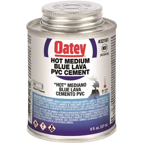 Medium bodied blue cement for use on all schedules and classes of PVC pipe and fittings up to 6 in Dia with interference fit. Low VOC solvent cement meets California south coast air quality management district (SCAQMD) 1168/316A or BAAQMD Method 40 and various environmental requirements. Very fast setting hot cement formulated for wet conditions and quick pressurization and fast installation. Recommended for potable water, sewer and DWV applications. Recommended application temperature of 40 to 110 deg F. No primer needed on non-pressure DWV, where local codes permit. Meets ASTM D2564.