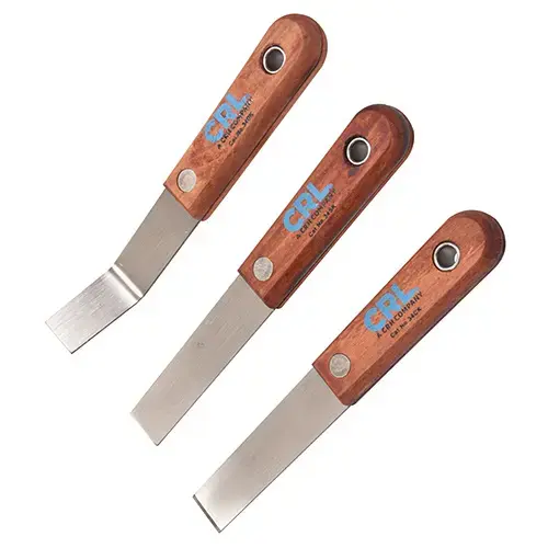 The CRL 3/4" Stiff Steel Putty knives are made with a .04" ( 1 mm) thick stainless steel blade that is tightly fastened to the wood handle and held by an eyelet rivet making them easy to hang for storage. They come in three different styles : a Bent Knife with a 35 radius bend, a Chisel Edge, and a Flat Edge Scraper. These are great narrow tools perfect for smoothing or scraping in tight spaces. The blade width is 3/4" (19 mm) and the overall lengthis 6-1/2" (165 mm). Sold individually or in a set.