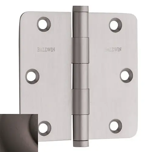 Baldwin 1/4" Radius Corner 3.5" x 3.5" Solid Brass Plain Bearing Mortise Hinge - Single HingeBaldwin's top of the line hinges set industry standards for excellence. These elegant hinges are available in several finishes to discretely accent your home while bringing the dependable performance you need.Manufactured from solid brass extrusions for both exceptional strength and precision tolerances, Baldwin hinges are individually machined from a solid brass bar resulting in a high quality hinge with increased wear performance. Each hinge is beveled on the inside leaf to obtain a perfect fit when closed.Plain Bearing Hinge: Plain bearing hinges feature knuckles that are machined to a smooth surface, allowing them to move against one another without bearings. Plain bearing hinges are not recommended for heavy use on high traffic entrance ways, but meet the need of a standard residential door.Material - Solid Brass: Solid brass is made from copper and zinc and is prized for its resilience, durability, and beauty. Solid brass can always be polished back to its original sheen and is highly resistant to rusting. Solid brass is often available in finishes that other hinge materials are not.Mounting: The standard corners for mortised door hinges are 1/4" radius, 5/8" radius and square corner. It is recommended that three hinges be used on doors up to and including 7.5 feet with one additional hinge for each additional 2.5 feet. Make sure you check your current hinges before making a purchase.There are brand names, and then there is Baldwin. Constantly building and re-building upon a time tested legacy of superior design, craftsmanship, functionality and innovation, Baldwin Hardware has delivered modern luxury to discriminating homeowners, architects and designers since 1946. From being the first to forge solid brass door hardware to setting precedence for Lifetime Finishes, Baldwin has been and always will be synonymous with revolutionary technology and unsurpassed quality. Aspire to make your home much more than mere shelter, and relax in the assurance that function and elegance can finally flourish within the same line of fine products—Baldwin can show you how.