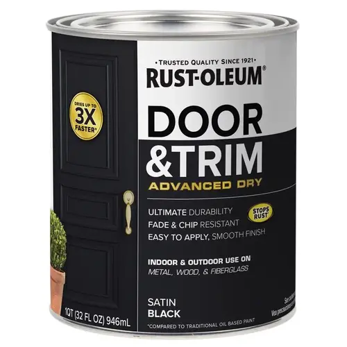 Quart, Black, Rust-Oleum Stops Rust Door and Trim Paint is a durable water-based coating for a variety of interior and exterior surfaces including metal, wood and fiberglass doors. This fast dry, smooth finish paint dries up to 3x faster than traditional oil-based paints. Easy to apply with brush or roller.