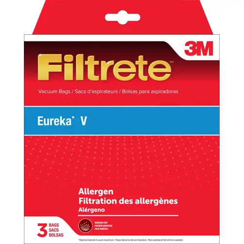 These vacuum bags keep your household cleaner by reducing dust that pollutes the air you breathe. Lessen dust-related allergies and improve your living environment with this great product. Decrease the irritating nuisance of dust floating in your rooms and collecting on your furniture. Regularly replace the bags in your Eureka vacuum with quality workmanship from Filtrete every 1-2 months. The Filtrete Eureka V Vacuum Bags fit Eureka 3800, 3900, 6700, 6800, 8000, 8200, 8900 Series Canisters/Power Teams. Standard quality filtration for household dust.