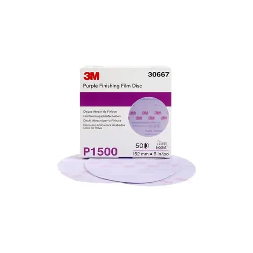 Our 3M™ Hookit™ purple finishing film abrasive disc 260L features an updated coating that levels surface defects on clear coat and greatly reduces pigtails. Aluminum oxide abrasive cuts fast, lasts a long time, resists loading with or without hole pattern designs and leaves a consistent, easy to polish finish. Our 3M™ Hookit™ attachment system makes disc change outs fast and easy.