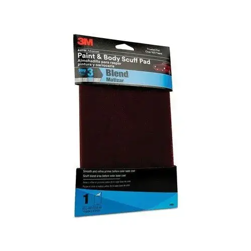 3M™ paint and body fine scuff pad is designed for scuffing base, primed or painted surfaces before base coat and clear coat application. This pad features a durable nylon backing. This non-woven fiber material will not shred, rust or splinter like steel wool can and is an excellent carrier for our fast cutting, long-lasting aluminum oxide abrasive. The entire pad is resin-coated, so neither the backing nor the abrasive will deposit tiny particles on the surface, helping to ensure a smooth finish. The pad is ideal for scuff sanding and is also suitable for removing light surface rust. It can be used wet or dry and rinses clean for repeat use.