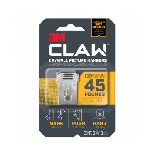 Introducing the new 3M CLAW drywall picture hanger! Trust your heavyweight hanging projects to the 3M CLAW drywall picture hanger proven to hold up to 15, 25 and 45 lb. The engineered hardened steel claws lock securely into drywall anywhere just push, hang and you're done.