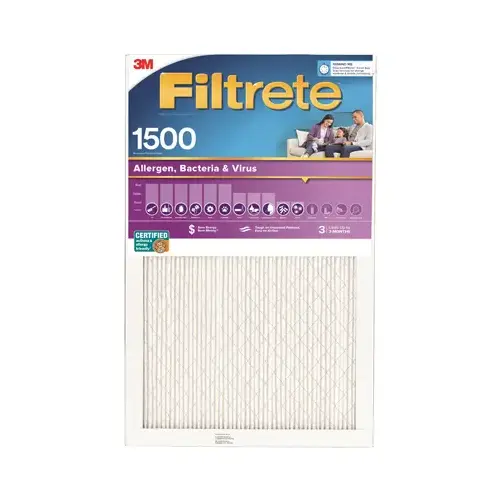 MPR 1500 Air Filter, made by 3M, helps capture unwanted particles from your household air to contribute to a cleaner, fresher home environment. Designed with exclusive Filtrete 3-in-1 technology, including a high MPR 1500 and MERV 12 rating, your AC filter will help pull and capture countless microparticles, such as pet dander, smoke, bacteria and up to 54% of virus airborne particles (1) while letting cleaner air flow through. Your Filtrete Filter will also capture large particles, including lint, pollen and household dust. This filter is also CERTIFIED asthma and allergy-friendly (2). Use a 3-month pleated 1-inch home HVAC filter in your furnace, air conditioner or HVAC system. For optimal performance of your heating and cooling system or HVAC system, change your furnace filter at least every 90 days. Note: For easy replacement reminders, create a change countdown in the Filtrete Smart App. Simply use the app to scan the barcode on your filters packaging, then choose 30, 60 or 90 days for your replacement countdown. When the filters life is up, you'll get a notification to change your filter. The No.1 Recommended HVAC Air Filter Brand (3), Filtretes Home Air Filters provide the breakthrough technology needed to change how we clean our air, by filtering out particles both large and invisible, to create a cleaner, healthier home for ourselves and our families. Residential use only. (1) Based on airborne MS2 virus testing. Initial efficiency. (2) As outlined in report ASCR: 1246-01. (3) Based on the 2022 Ipsos US Brand Health Study of Residential HVAC Air Filters.