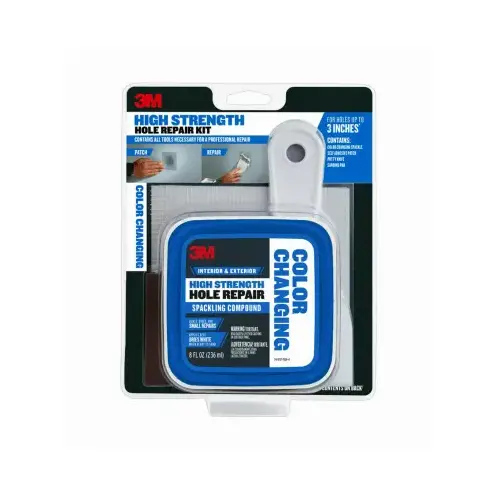 3M High Strength Hole Repair Color Changing Spackling Compound Kit. Kit includes Color Changing Spackling Compound, 3" putty knife, 4" drywall repair screen and sanding pad.