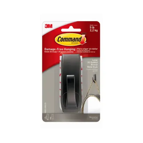 Command Large Hook, 5 lb Weight, 1 Hooks, Projection: 3/4 in, Metal, Oil-Rubbed Bronze, Dimensions: 4 in H x 1-1/2 in W, Includes: (2) Strips