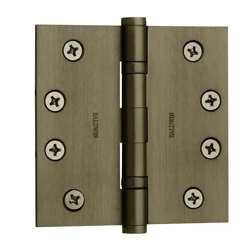Baldwin Square Corner 4" x 4" Solid Brass Ball Bearing Mortise Hinge - Single HingeBaldwin's top of the line hinges set industry standards for excellence. These durable hinges are available in several finishes and are strong enough for light commercial use, bringing the dependable performance you need wherever you need it.Manufactured from solid brass extrusions for both exceptional strength and precision tolerances, Baldwin hinges are individually machined from a solid brass bar resulting in a high quality hinge with increased wear performance. Each hinge is beveled on the inside leaf to obtain a perfect fit when closed.Ball Bearing Hinge: Ball bearing hinges are designed to handle the extra stress brought on by high traffic doorways. The greased bearings reduce the rotational friction extending the life of a hinge in heavy use situations. These hinges tend to be more durable than standard, or plain bearing hinges.Material - Solid Brass: Solid brass is made from copper and zinc and is prized for its resilience, durability, and beauty. Solid brass can always be polished back to its original sheen and is highly resistant to rusting. Solid brass is often available in finishes that other hinge materials are not.Mounting: The standard corners for mortised door hinges are 1/4" radius, 5/8" radius and square corner. It is recommended that three hinges be used on doors up to and including 7.5 feet with one additional hinge for each additional 2.5 feet. Make sure you check your current hinges before making a purchase.There are brand names, and then there is Baldwin. Constantly building and re-building upon a time tested legacy of superior design, craftsmanship, functionality and innovation, Baldwin Hardware has delivered modern luxury to discriminating homeowners, architects and designers since 1946. From being the first to forge solid brass door hardware to setting precedence for Lifetime Finishes, Baldwin has been and always will be synonymous with revolutionary technology and unsurpassed quality. Aspire to make your home much more than mere shelter, and relax in the assurance that function and elegance can finally flourish within the same line of fine products—Baldwin can show you how.