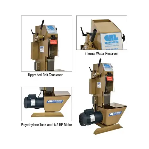 This CRL Bench Model Belt Sander uses all standard 4" x 64" (102 mm x 1.63 m) Wet or Dry Abrasive Belts, and is specially designed for use in the shop or on the job site. It's perfect for bench work where there is only a limited need for edge-work capacity. This Sander can also be mounted right onto a glass truck for rough grinding, smoothing, and polishing the edges of glass on a job site. Water for wet grinding sprays on the back of the belt from a built-in spray nozzle connected to a built-in water tank. Just pour water in the holding tank and you can wet grind anywhere.