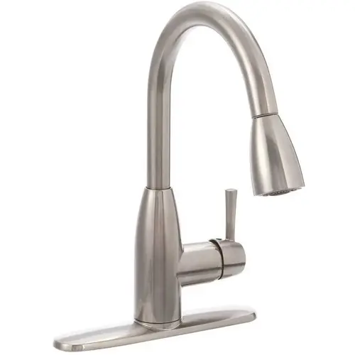 The Fairbury Single-Handle Pull-Down Dual Spray Faucet from American Standard updates your kitchen with statement-making style and superior functionality. This high-arc faucet with swivel spout makes it easy to fill large pots. Ergonomic, pull-down spray head provides a comfortable grip and push-button access to stream, spray and pause functions. This faucet is easy to install in kitchens with 1, 2, 3, or 4-holes in your sink or countertop, making it the perfect choice for any faucet refresh.