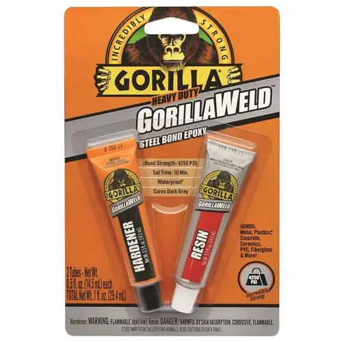 Gorilla Weld is an incredibly strong, heavy duty 2 part adhesive. The tough, steel bond epoxy formula has a 4250 psi bond strength and sets in just 10 minutes. Gorilla Weld is waterproof and versatile, creating a long lasting, permanent bond to: metal, plastics, concrete, ceramics, PVC, fiberglass and more.