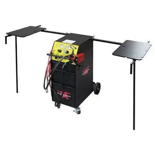 The 6071 Bumpersmith 2.0 offers a unique combination of capabilities in one compact unit. It has a state-of-the-art nitrogen plastic welding system combined with a clever bumper workstation which allows the technician to hold the bumper in just about any position for easy repair work. The nitrogen welder features a switch in the handle to help conserve bottled nitrogen gas easily actuated by the palm of the technician's hand, the welder only flows nitrogen gas when needed. Otherwise, the heating element is kept cool with the shop's compressed air. The easy-to-understand analog control system features output pressure gauges for both air and nitrogen and a flowmeter for repeatable performance. As a workstation, the Bumpersmith 2.0 easily folds out to hold any size bumper, from Chevy Sonic to Chevy Tahoe. The bumper pads are notched allowing for the bumper to be held down easily with the included bungee cords. Using the extension rods, the bumper can also be held in a vertical position to allow repair on the ends. The bumper pads can also hold headlights securely for repair by one technician. When finished, the bumper pads and supports affix to the sides of the Bumpersmith 2.0 for compact storage.