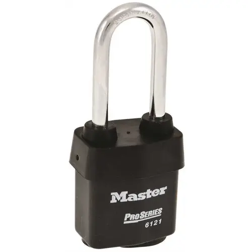The Master Lock Number 6121LJ ProSeries Weather Tough Covered Laminated Padlock multiple locks open with the same key features a 2-1/8 in. W (54 mm) heavy steel body to withstand physical attack and a 2-1/2 in. H (64 mm), 5/16 in. Dia (8 mm) hardened boron alloy shackle for superior cut resistance. The exclusive cover protects this padlock from harsh elements and a high security, rekey able 5-pin cylinder with spool pins is virtually impossible to pick. The Limited Lifetime Warranty provides peace of mind from a brand you can trust.
