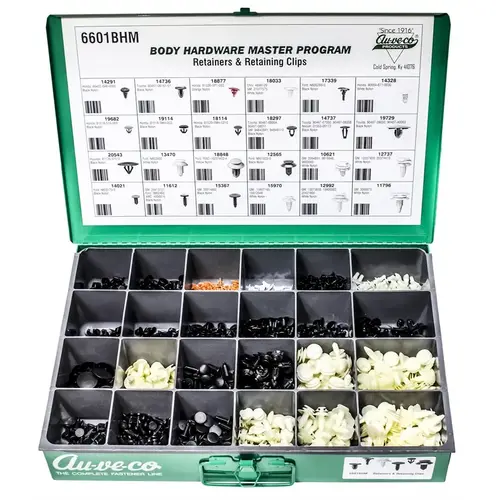 Based on Auveco's very popular DB-428 Display Boards, we have developed 20 different large metal drawer assortments. These assortments contain 428 of the most popular domestic and foreign Body Hardware Clips and Fasteners. Each drawer is set up to accommodate the Auveco unit package quantity. No more problems with refills.