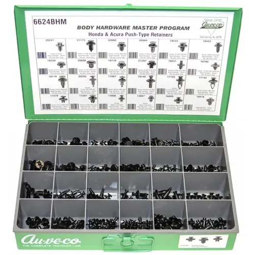 These additional Body Hardware assortments contain category-focused and manufacturer-focused domestic and foreign Body Hardware Clips and Fasteners. Each drawer is set up to accommodate the Auveco unit package quantity