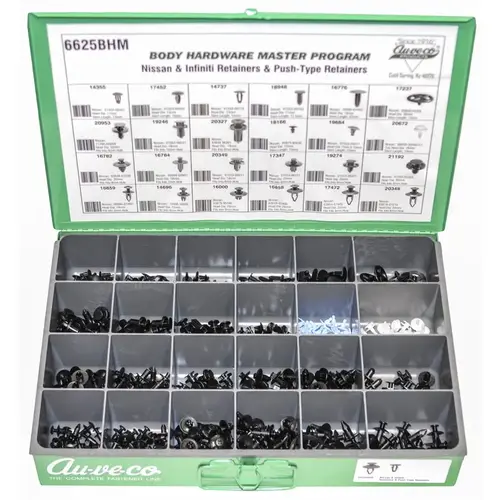 These additional Body Hardware assortments contain category-focused and manufacturer-focused domestic and foreign Body Hardware Clips and Fasteners. Each drawer is set up to accommodate the Auveco unit package quantity