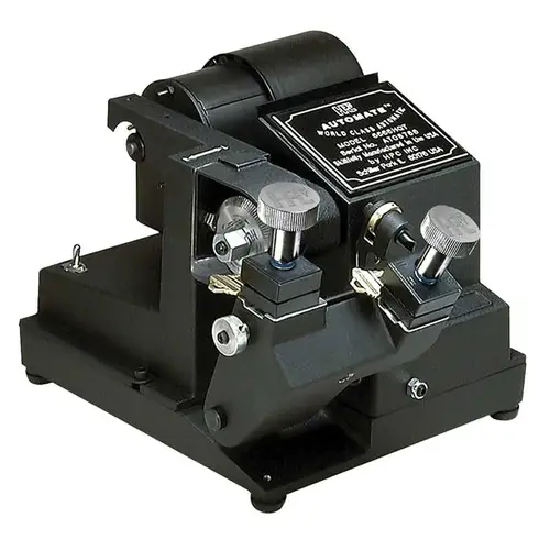 The Automate is a fully-automatic heavy-duty key duplicator. It is equipped with 4-way jaws to securely hold a wide variety of keys including double-sided automotive and small furniture keys. The high-performance motor provides ample torque and the double-angle tool steel cutter makes for precise duplicating. An optional carbide cutter is available for longer cutter life, particularly beneficial when cutting harder key blanks. The cutting cycle takes only 12 seconds, making quick work of cutting a lot of keys. Just load the keys and press the button, the Automate will do the rest, leaving you free to go back to your customer or other work at hand. Simple operation and consistent results make the Automate an ideal machine even for your apprentice to use.