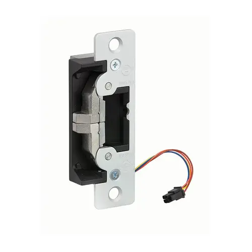 Function This non-handed strike features an ultra-compact design and adjustable stainless steel keepers with over 1,500 lbs [680.4 kg] of holding force in fail secure mode. The strike releases electrically with up to 25 lbs of door preload. Single solenoid operates on 12/16/24 VDC power. Remote electrical control of narrow stile aluminum doors equipped with an Adams Rite 4500, 4700 (discontinued), or 4900 Deadlatch or cylindrical lockset with 1/2" [12.7 mm] to 5/8" [15.9 mm] latchbolt projection. Electrical actuation unlocks the keeper, releasing the latchbolt so the door may be opened without operating the latch itself.