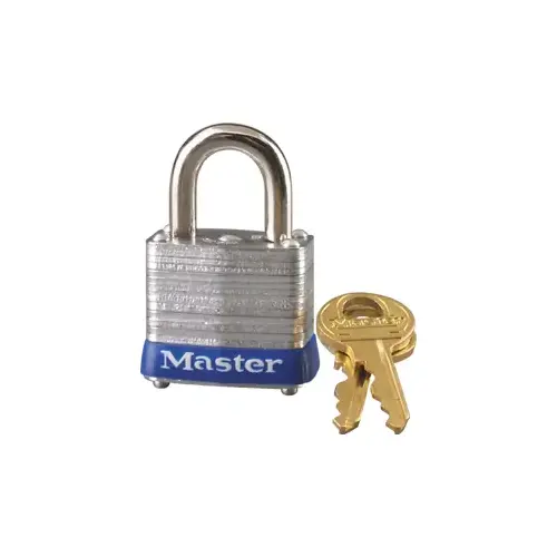 The Master Lock No. 7KA Laminated Steel Padlock, Keyed Alike – multiple locks open with the same key - features a 1-1/8in (29mm) wide reinforced laminated steel lock body providing extra strength and a 9/16in (14mm) tall, 3/16in (5mm) diameter steel shackle. Dual locking levers provide extra pry resistance making it ideal for industrial applications and the non-rekeyable, 4-pin W7 cylinder helps prevent picking. Keyed alike padlocks available to order to match other locks with the W7 cylinder.