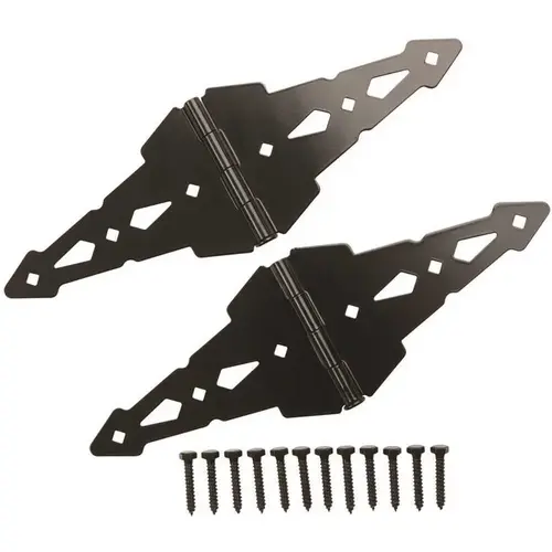 Finish your surface jobs with the ease of this 8 in. heavy-duty decorative strap hinge. Ideal for surface applications on doors, gates, sheds and tool boxes, its bearing design eliminates metal-to-metal contact and the offset screw holes prevent wood from splitting. This hinge™s black finish creates a decorative appearance. Designed for right- or left-handed applications, it includes all necessary mounting hardware, so you can enjoy easy installation.