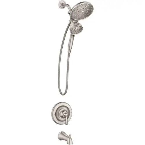 The Brecklyn tub and shower faucet provides a traditional look that appeals to those with classic style preferences. The showerhead is a combination rainshower and handshower featuring Moens innovative Magnetix technology on the handshower. Handshowers with Magnetix offer a powerful magnetic dock that allows for easy release and secure return of the handshower, even with your eyes closed. Brecklyn includes a 6.75-inch spray face on the rainshower and a 3.75-inch spray face on the handheld, as well as six high-performance spray functions, for the ultimate spa-like experience. Moens unique Posi-Temp pressure-balancing valve adjusts automatically to changes in water line pressure ensuring constant and comfortable water temperatures. The fixture is available in Moens exclusive Spot Resist Brushed Nickel finish which resists fingerprints and water spots to maintain the fixtures brilliance.
