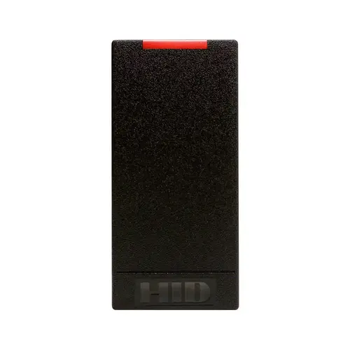 Model R10 - Designed for door applications requiring a small footprint card reader. No 125 KHz support, maximum security, weigand controller communication, pigtail, revision E, Black and standard configuration.