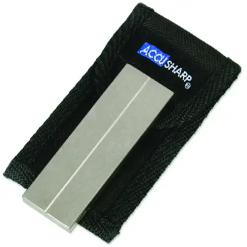 The dual-sided pocket sharpening stone features both a coarse 320 grit and a fine 800 grit diamond surface and also include a groove for sharpening hooks and darts.