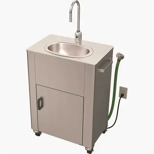 Deluxe Stainless Portable Sinks are designed to provide hand washing capabilities in areas not normally equipped for it. Portable Wash-Ware units can be set up anywhere--inside or out. This model is supplied by an onboard 5 Gal. freshwater tank and operates via on-demand electric pump. The waste is collected in an onboard 6 Gal. tank. The single handle gooseneck faucet has a 0.5 GPM flow control.