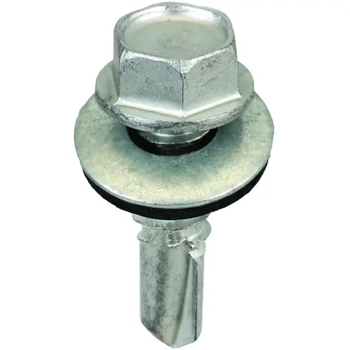 Metal to metal sealing self-drilling tapping screws made from C1022 steel, case hardened for roofing and siding applications. The screws have a #3 drill point and are designed for 26 ga and heavier metal to join laps and to stitch corner and rake trims and the ridge cap where they overlap wall steel. A 3/8 in across flats high hat hex washer head with assembled EPDM washer offers easy driving and conforms to the metal surface for a secure and long-lasting seal. All screws are 1000 hr salt spray test dacro-coated. All Acorn International screws are packed 250 pieces in a heavy-duty tear-off resealable bag, UPC coded and retail ready. All bag and carton labels are trilingual. Cartons are heavy-duty cardboard of uniform size and yellow color for better retail identity.