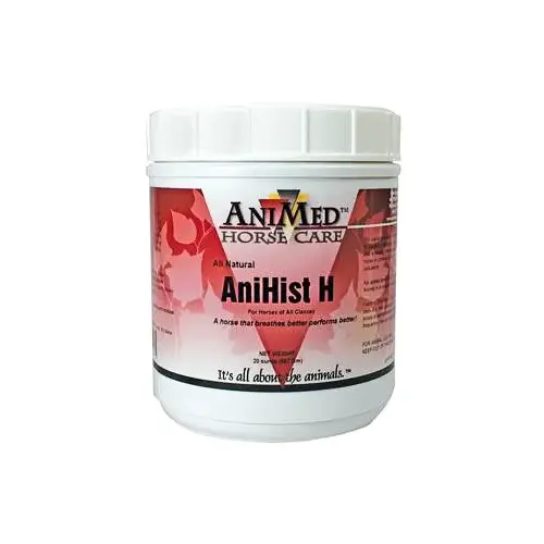 AniHist H was developed to help horses breathe better. All-natural support for seasonal allergies, respiratory health, normal histamine levels, and a healthy immune system in horses. Also aids your horse in combating environmental irritants and pollutants. AniHist H contains a blend of natural ingredients, including peony root, ginger, choline chloride, vitamin D, and vitamin C.