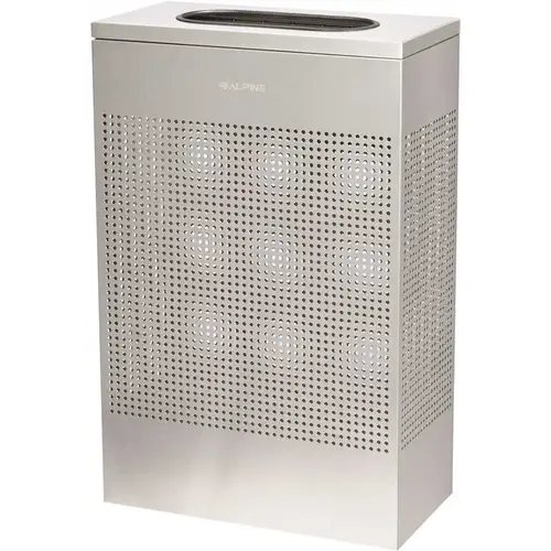 Alpine Industries 13 Gallon SS Perforated Rectangular Decorative Trash Can Design: Maximize Space With Our Receptacle's Squared-Off Shape That Seamlessly Fits Into Corners. Durable: Its stainless steel construction ensures lasting sophistication and strength. Practical: Each receptacle is outfitted with bag clips to keep trash bags securely in place for easy management. Convenient: The hinged lid allows for quick, hassle-free disposal. Stable: At 24.25 lbs., it's heavy enough to stay put yet light enough to move when needed. Capacity: Its 13-gallon capacity can hold a substantial amount of waste without taking up too much room. Color Options: Available in both black and stainless steel to suit any environment. Stability: Each trash container is equipped with adjustable legs, providing enhanced stability and support on any surface. Capacity: 13 Gallon Perforated design adds an upscale look Durable powder-coated metal construction Covered top contains content inside while large hole makes for easy waste disposal Mfg #ALP438-13-SS