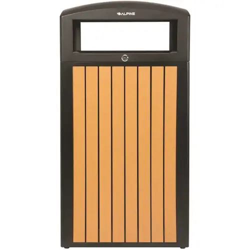 Alpine Industries 40 Gal. Cedar Steel AW Commercial Outdoor Can Receptacle & Lid. Hassle-Free: You Will Never Need To Worry About Chipped Or Faded Paint Because Recycled Plastic Doesn t Require Any Painting Or Staining.. Affixed: Inside each receptacle are chain link security chains that will keep your lid from falling off. . Adjustable legs on the bottom ensure stable support on uneven surfaces. Durable: The recycled material won t crack or splinter, especially in harsh weather conditions.. Low Maintenance: Our substantially sized 40-gallon, leak-proof liner will require less emptying.. Free Flowing: Its slotted bottom will allow rain and snow to pass through and not build up.. Outfitted: Each trash container has adjustable legs to ensure stability and support. . Stability: The included mounting hardware enables you to secure the receptacle in place.. Efficient: Deigned to glide water off the top, the dome shaped lid is great for repelling water and snow. . Protection: It is equipped with a lock that will prevent tampering or vandalism.. Dimensions of The Opening: 5.51 H x 18.11 W. Material: Powder Coated Steel and Recycled Plastic. Can anchor trash can to the ground (accessories not included). Decorated cedar wood like panel will look great in any outdoor setting. Mfg #ALP471-40-WD-CD