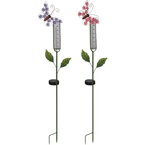 Solar butterfly rain gauge stake with LED lights. Beautiful and functional garden stake features a colorful butterfly, in purple or pink (cannot specify color). Features wings filled with tiny flowers and 7-piece cool white LED string lights, providing an eye-catching accent day and night. In the evening, the lights illuminate the glass rain gauge and last up to 6 to 8 hours on a full solar charge. Place the stake in an open area to properly capture rainfall and sun rays to power the lights. The durable metal construction provides long-lasting enjoyment. Each stake measures 4 In. W. x 39 In. H. x 9 In. L. Includes a one-year manufacturer's warranty from date of purchase.