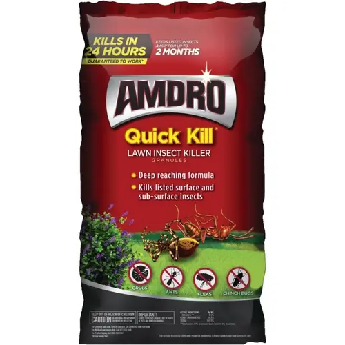 The soil-penetrating formula kills lawn damaging insects like grubs and mole crickets below the surface. It also kills surface insects like ants, spiders, fleas and ticks. Spread it over your entire lawn to kill listed pests in just 24 hrs and keep them away for up to 3 months.