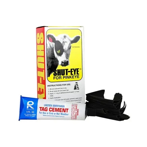 Shut-Eye Pinkeye Patches - Protective eye patch completely covers the infected eye with a dome designed to fit the curve of the animal's head. Will not come in contact with the eye. Holds medication in place and protects eye from irritation by insects, grass, weeds, wind and sunlight. Packaged with cement.