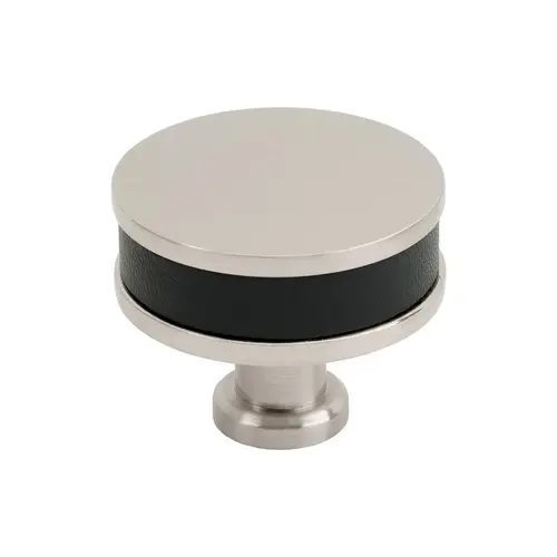 The Amerock BP37536BLG10 Fairlane 1-1/2 inch (38mm) Diameter Knob is finished in Black Leather/Satin Nickel.