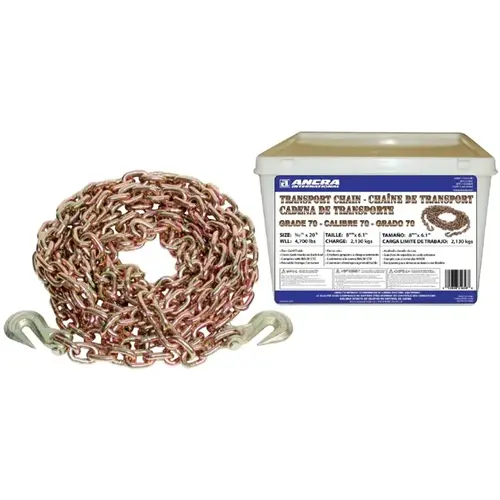 Grade 70 chain was designed specifically to provide a strong chain for tie downs. Made from carbon steel and zinc-plated gold chromate for corrosion resistance. Heat-treated and 100% proof tested to 2X WLL rating. Made to NACM standards per specifications of the department of transportation and CCMTA for Tie Down use with properly marked links. All clevis hooks are made of heat-treated alloy steel.