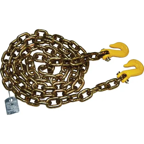 Ancra's grade 70 XHD 3/8 in x 10 ft chain assembly is an ideal choice for heavy-duty tie-down tasks. Built with strong carbon alloy steel and finished with zinc-plated gold chromate for resistance against rust and corrosion, the chain assembly is extremely durable. Having been heat-treated, the assembly is also 100% proof-tested to twice its original working load limit for a total WLL of 6600 lb. Oversized grade 80 clevis hooks provide improved strength over grade 70 construction and are similarly heat-treated for improved performance, while increased material in the neck of the hook helps to reduce cracking due to trapped side pulls. The grade 70 XHD 3/8 in x 10 ft chain assembly with grade 80 clevis hooks is made to NACM standards per specifications of the Department of Transportation and CCMTA for tie-down use with properly marked links and aluminum tags with stamped WLL information.