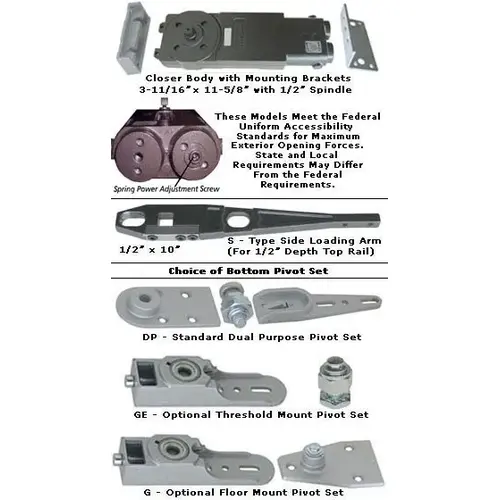 Closer body with mounting brackets; Side load top arm and block; Bottom pivot set; Installation fasteners