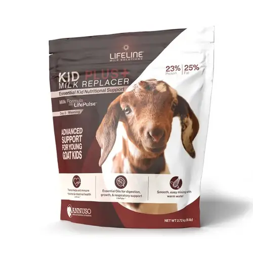 Kid Plus+- Milk Replacer is an optimal blend of 23% protein and 25% fat formulated with LifePulse for added support. Guaranteed Analysis: Crude Protein, min ...23 Crude Fat, min ...25 Lysine, min ...2.0 Calcium, min...0.75 Calcium, max...1.25 Phosphorus, min ...0.6 Copper, min ...4.6 ppm Copper, max ...5.5 ppm Selenium, min...0.3 ppm Vitamin A, min ...16,000 IU/lb Vitamin E, min...160 IU/lb Ingredients: Dried Whey Protein Concentrate, Dried Whey, Condensed Whey, Animal Plasma, Animal Fat (preserved with BHA, BHT or Citric Acid), Vegetable Fats, Monoglycerides of Edible Oils, Silicon Dioxide, Dried Skim Milk, Dicalcium Phosphate, L-Lysine Monohydrochloride, Calcium Carbonate, L-Threonine, DL-Methionine, Lecithin, Polyoxyethylene Glycol 400 (mono & dioleates), Vitamin E Supplement, Ascorbic Acid, Ferrous Sulfate, Manganese Sulfate, Oregano Oil, Thyme Oil, Natural Flavors, Anise Oil, Zinc Sulfate, Iron Proteinate, Vitamin A Supplement, Zinc Proteinate, Manganese Proteinate, Selenium Yeast, Brewers Dried Yeast, Copper Proteinate, Vitamin D3 Supplement, Sodium Selenite, d-Calcium Pantothenate, Niacinamide, Maltodextrin, Biotin, Calcium Iodate, Riboflavin, Folic Acid, Vitamin B12 Supplement, Pyridoxine Hydrochloride, Thiamine Mononitrate, Menadione Sodium Bisulfite Complex (source of Vitamin K3), Cobalt Sulfate