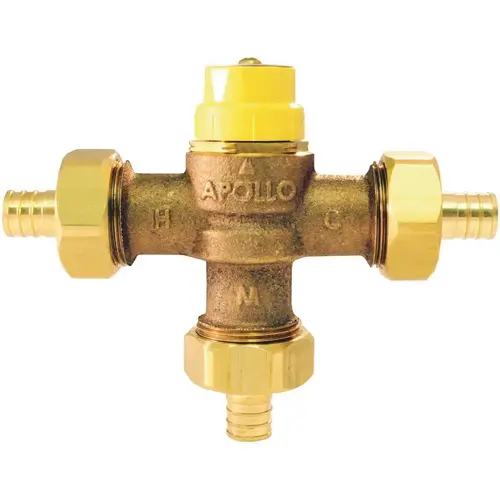 The Apollo Valves 3/4 in. Lead Free Bronze PEX Barb Thermostatic Mixing Valve is designed to control and limit volumes of cold and hot water required to deliver mixed water at predetermined temperatures for single or multiple fixtures. This valve is suitable for point-of-use or point-of-source applications. It also features a tamper resistant maximum temperature setting adjustment.