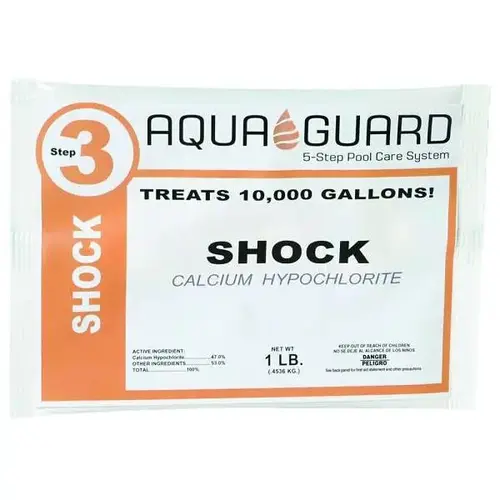 AquaGuard Calcium Hypochlorite Shock. 1 Lb Bag. Kills Bacteria, Destroys Organic Contaminants, Controls Algae. 59.5% Calcium Hypochlorite. Swimming Pool Water Oxidizer. Great For Shocking Swimming Pool Water. Brand May Vary By Region. Case Of 24. Mfg #REF-50-1225