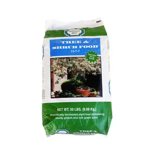 Arizona's tree and shrub food with a N, P and K of 13-7-7 is a formula of nutrients which support sturdy growth of trees, shrubs and evergreens. Added sulfur helps plants to withstand weather extremes and improves overall color. Most trees and shrubs benefit from a feeding 3 to 4X a year during the growing season. Make the first feeding in early Spring just before new growth starts, the second and third feeding should be made in the middle and late Spring, at 6 to 8 week intervals and the fourth feeding in September.
